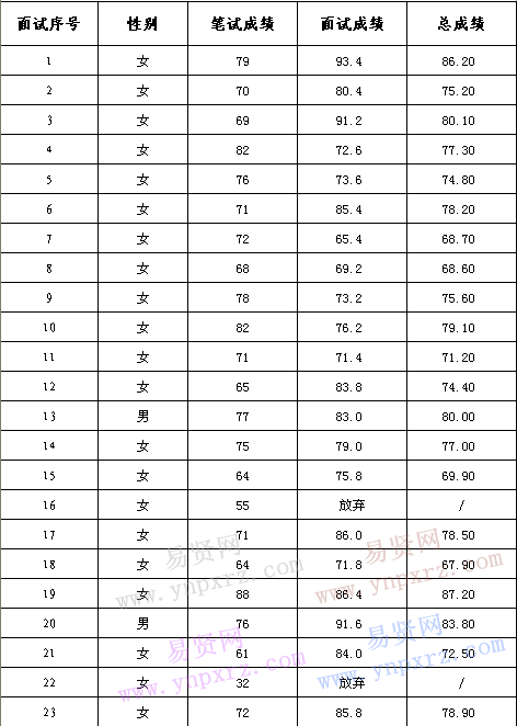 总成绩计算公式:总成绩=笔试(专业技能测试)成绩0.5+面试成绩0.5;总成绩计算到小数点后两位,尾数四舍五入。