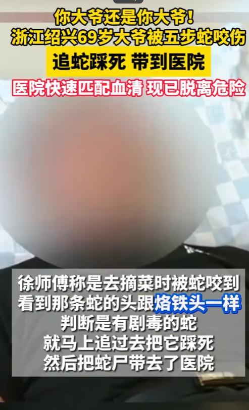 “太狠了!”2025年6月,浙江绍兴,一名69岁的大爷被五步蛇咬伤,然而,下一秒,大爷立马追上去,把蛇踩死!然后,带着蛇跑到医院,医生看到蛇后立马给匹配血清!网友:你大爷还是你大爷!