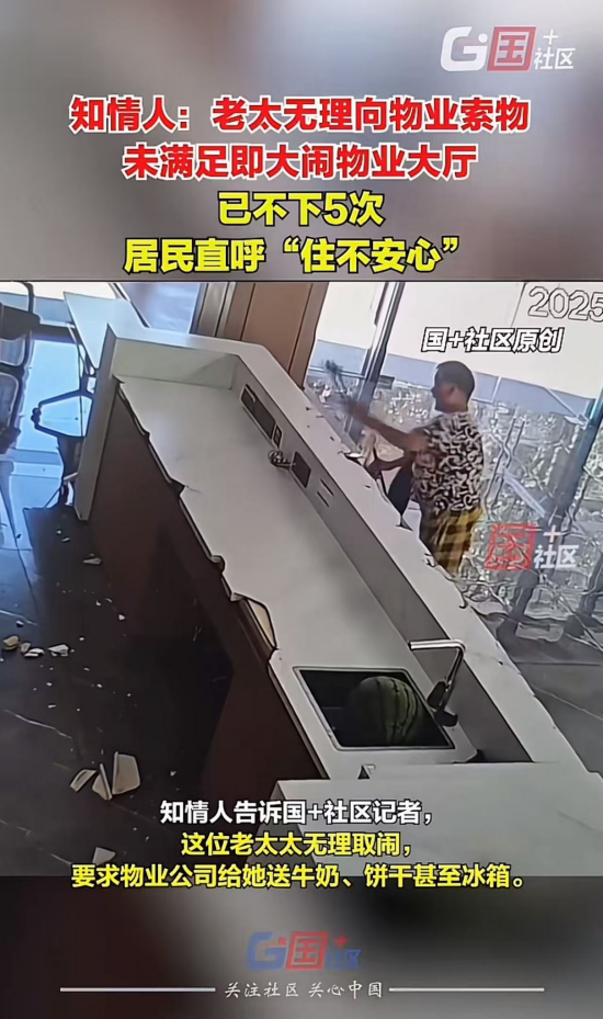 绝了!浙江绍兴,一位老太太因不满物业服务,屡次无理取闹,要求物业送牛奶、饼干、冰箱,得不到就砸物业大厅,甚至用锤子把前台都拆了。知情人爆料,“这样的闹剧已经不下五次”,小区居民天天过得跟提心吊胆一样,物业公司也无奈选择起诉。