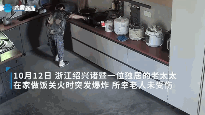 意外还是发生了!10月13日报道,浙江绍兴一82岁老太在家中做饭,关煤气时突然发生爆炸,不仅餐具被炸飞,连老太都被震得连连后退!好在老太非常镇静,及时关闭了煤气罐,再加上橱柜和灶台都防火,这才没有造成更大的损失。网友:老人福大命大!